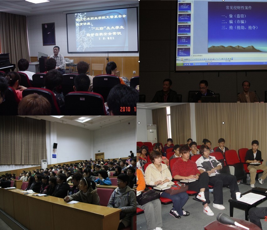 3.安全讲座和参加安全演习。每年一期安全知识专题讲座,主讲人有警官、保卫处长、保卫干事和系团总支安全委员。先后组织全系的学生安全干部、各班及系团学核心力量和全系学生尤其是刚进校的一年级新生聆听。安全演习由学院保卫处组织,系班学生安全干部做好配合,动员和带动本系学生积极参与。