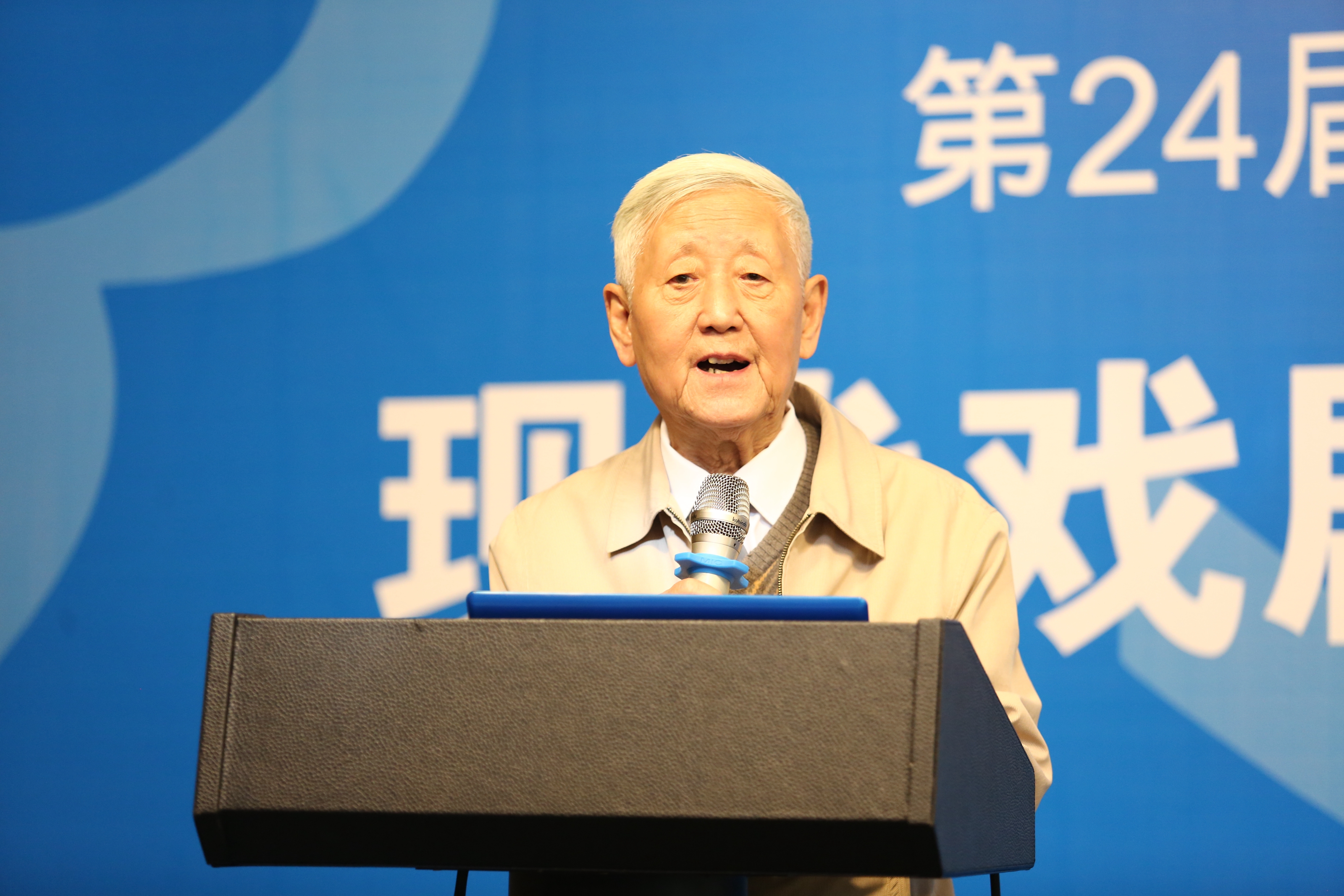 徐晓钟发表讲话。他说,20多年来,中国、韩国、日本三国戏剧艺术家一直在艺术上寻求一种共识,就是我们的三国的戏剧艺术,如何使自己民族的传统和现代有价值的戏剧文学相结合,如何构建我们自己的、民族的现代戏剧,让我们戏剧更好地与时代对话,与全球对话。23年以来,一方面是通过展示我们三国的戏剧舞台演出,另一方面就是通过戏剧艺术论坛,更好地交流我们三个国家的艺术家在这一方面的思索和实践。今天第24届BeSeTo(中韩日)戏剧节的国际学术研讨会的主题是“现代戏剧表演的国际视野和教育实践”,希望在我们的研讨会上,能够深刻地讨论、交流我们对这个主题的深刻思考。我想,这就是第24届BeSeTo(中韩日)戏剧节为我们三国戏剧艺术的发展,在我们美丽的杭州开出的又一支花,结的又一个果。