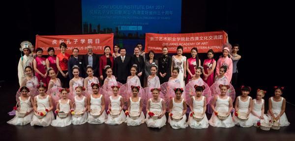 为庆祝2017年孔子学院日和浙江-西澳友好省州三十周年,西澳大学孔子学院邀请了浙江艺术学院青年实验艺术团到西澳首府珀斯进行演出交流。孔子学院精心组织、通过多种媒体广泛宣传,演出团还没到达,票已预订一空。这场期待已久的演出不负众望,开场舞蹈《古舞新韵》让全场观众折服,接下来的蒙古族舞蹈《草原游子》、江南舞蹈《且吟春雨》、畲族舞蹈《佘家女儿拍》以及傣族舞蹈《吉祥树》等民族特色舞蹈让观众沉醉,现场还有古筝独奏《雪山春晓》、琵琶独奏《彝族舞曲》和二胡独奏《万马奔腾》以及藏族歌曲《在那东山上》等器乐、声乐节目精彩纷呈,博得全场观众的热烈掌声。用中国乐器演绎的澳洲人耳熟能详的摇滚曲“Thunderstruck”更是引起全场观众的共鸣。谢幕节目《人间西湖》用优美歌声和舞蹈表达了美丽、开放和热情的杭州欢迎世界朋友的到来。演出结束后,中国驻珀斯雷克中总领事和夫人、西澳大学和州政府文化部门的代表登台与演员们握手合影,祝贺演出成功。