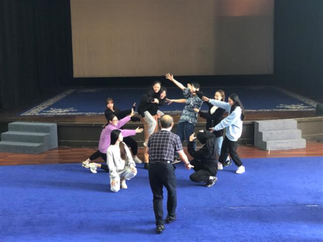 这次工作坊课程也着重在形体释放与肢体交流中展开。同学们三人或五人一组,用自己的肢体语言和行为方式表达出内心的独白,并有感情地叙述出来。肢体动作的灵活运用,是通过表演元素训练来展现出一个故事,目的是为了让大家去感受对方,从而形成舞台上的交流。