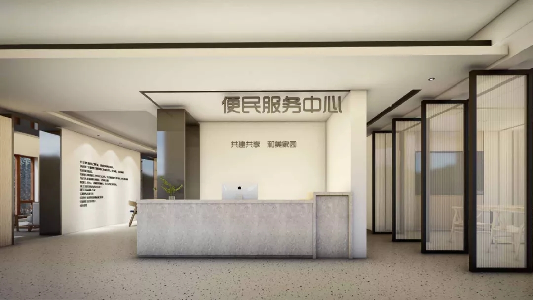 一层便民服务中心,入口区有一个岛台形式的接待吧台,作为面临着东南面的主入口的形象,又同时考虑到跟东面从负一楼上来的这个楼梯通道的关系。岛台一侧放置会议空间,一侧放放置智能化的自助服务。