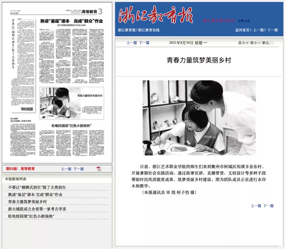 我系勇当“校地合作”先行者,给当地乡村带来了发展的新动力,成效明显,反响热烈。先后受到了《中国网》《浙江教育报》《教育之江》等多家主流媒体的报道与宣传,也广受农户、游客、学生好评。浙江省委副书记、统战部部长黄建发、省文旅厅的领导来余东,对浙艺这么接地气的活动,都给予了高度肯定。