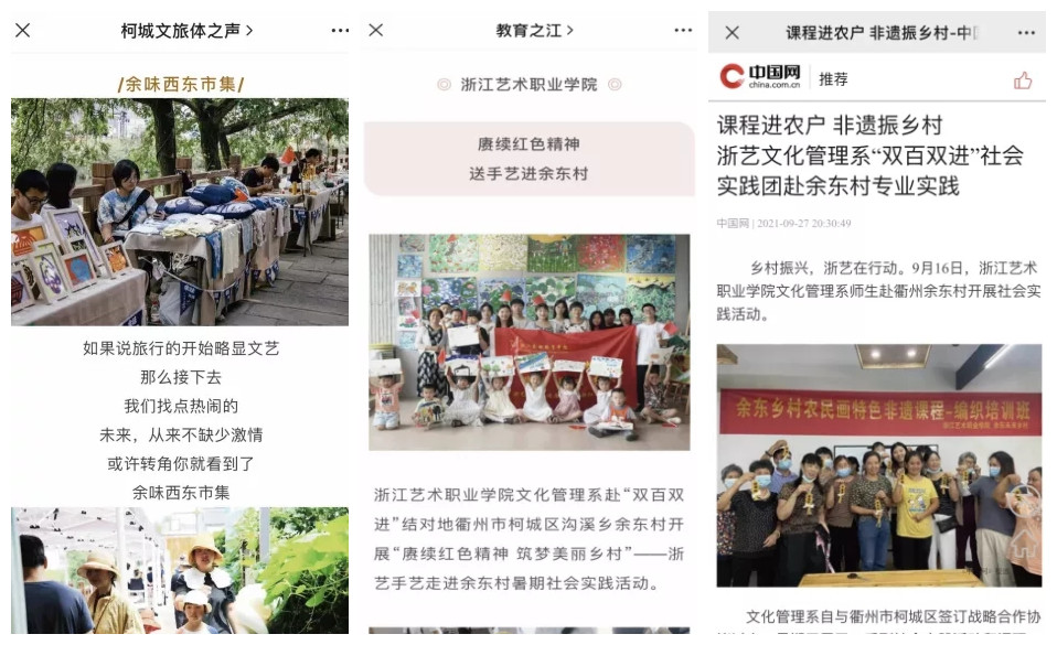 自2021年7月,文化管理系与衢州市柯城区战略合作签约以来,校地双方充分发挥各自优势,协同推进乡村文化基因的解码、转化与利用,共谋共建当地文化地标,推动未来乡村建设上新台阶,为构建新发展格局,打造山区26县跨越式高质量发展的的标杆样板,推动共同富裕贡献了各自力量,开启了校地合作新篇章。随着余东村非遗手工艺研学课程开发与推广、妙源村打造"大地博物馆"和“乡村会客厅”项目的逐个落地,校地合作结出首期成果。