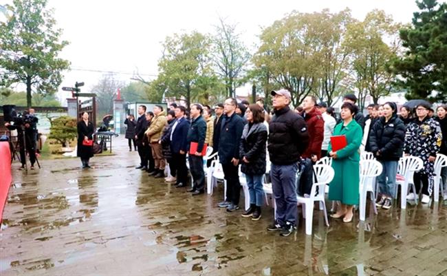 夏开堂与王毅在粟裕将军骨灰敬撒处敬献花篮,全体人员肃立、行礼。细雨蒙蒙,天地同感,现场全体人员在雨中齐唱《新四军军歌》,“千百次抗争,风雪饥寒;千万里转战,穷山野营。获得丰富的斗争经验,锻炼艰苦的牺牲精神……”不忘先辈苦辛,弘扬爱国精神。