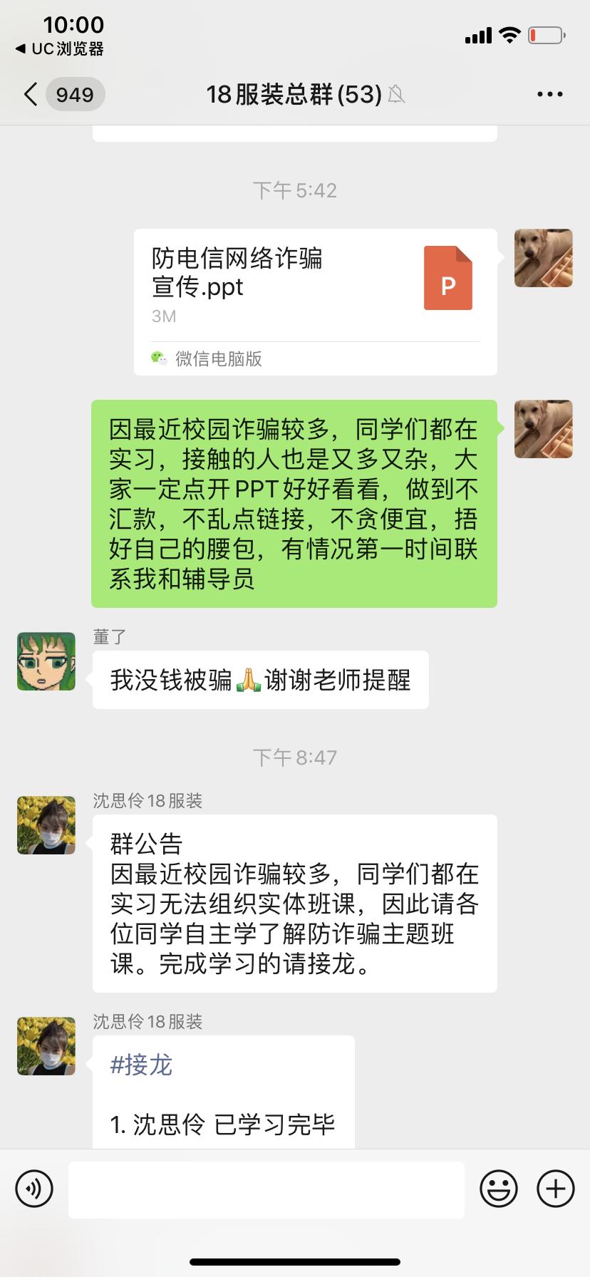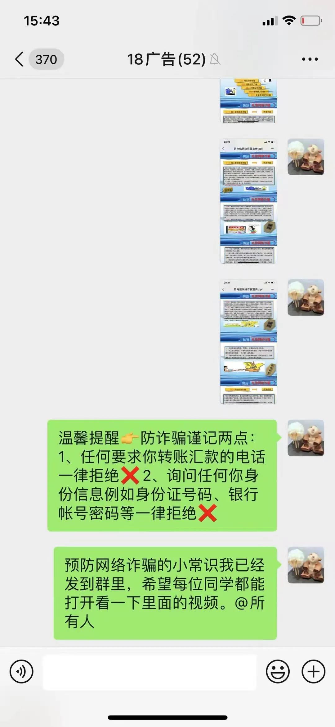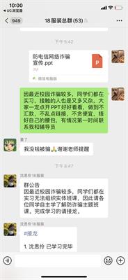 美术系通过美术系公众号、班级微信群、QQ群加强新媒体宣传,每日各班班级群推送防范诈骗信息。向各班级发放防诈骗宣传告知书。