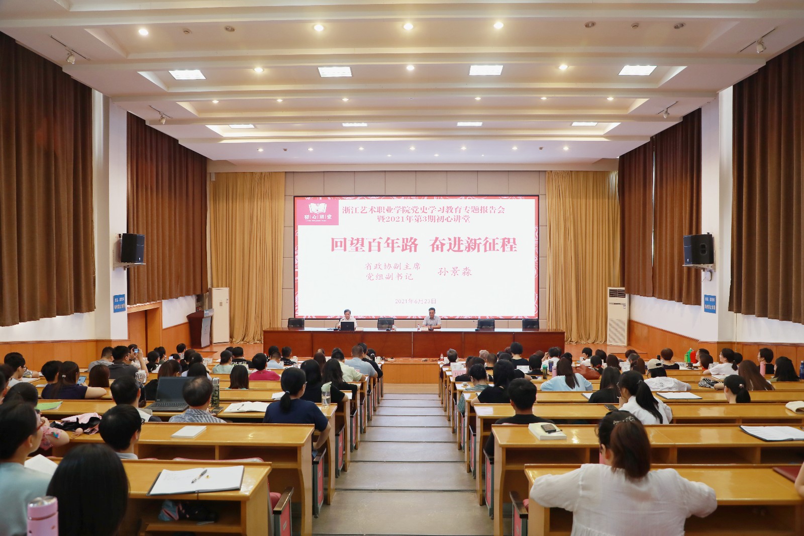 623日下午,我校党史学习教育专题报告会暨第3期“初心讲堂”在图书信息中心报告厅举行。省政协副主席、党组副书记孙景淼应邀为我校干部和党员作题为《回望百年路  奋进新征程》专题讲座。校党委书记薛亮主持讲堂,校党委班子成员、处科级干部和师生党员代表参加学习。