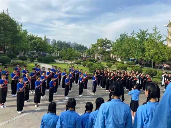 紧接着,朗朗诵读声中,2019级小百花班全体女生身着蓝色学生服,以戏曲人独有的方式,声情并茂地演绎了越剧版《唱支山歌给党听》,优美婉转的歌声在清晨校园中回荡。台上,鲜艳的党旗迎着朝阳徐徐展开,台下,师生们挥舞着手中的红星。就这样,鲜红的党旗、鲜艳的国旗、殷红的红星在朝阳之下熠熠生辉、交相呼应。