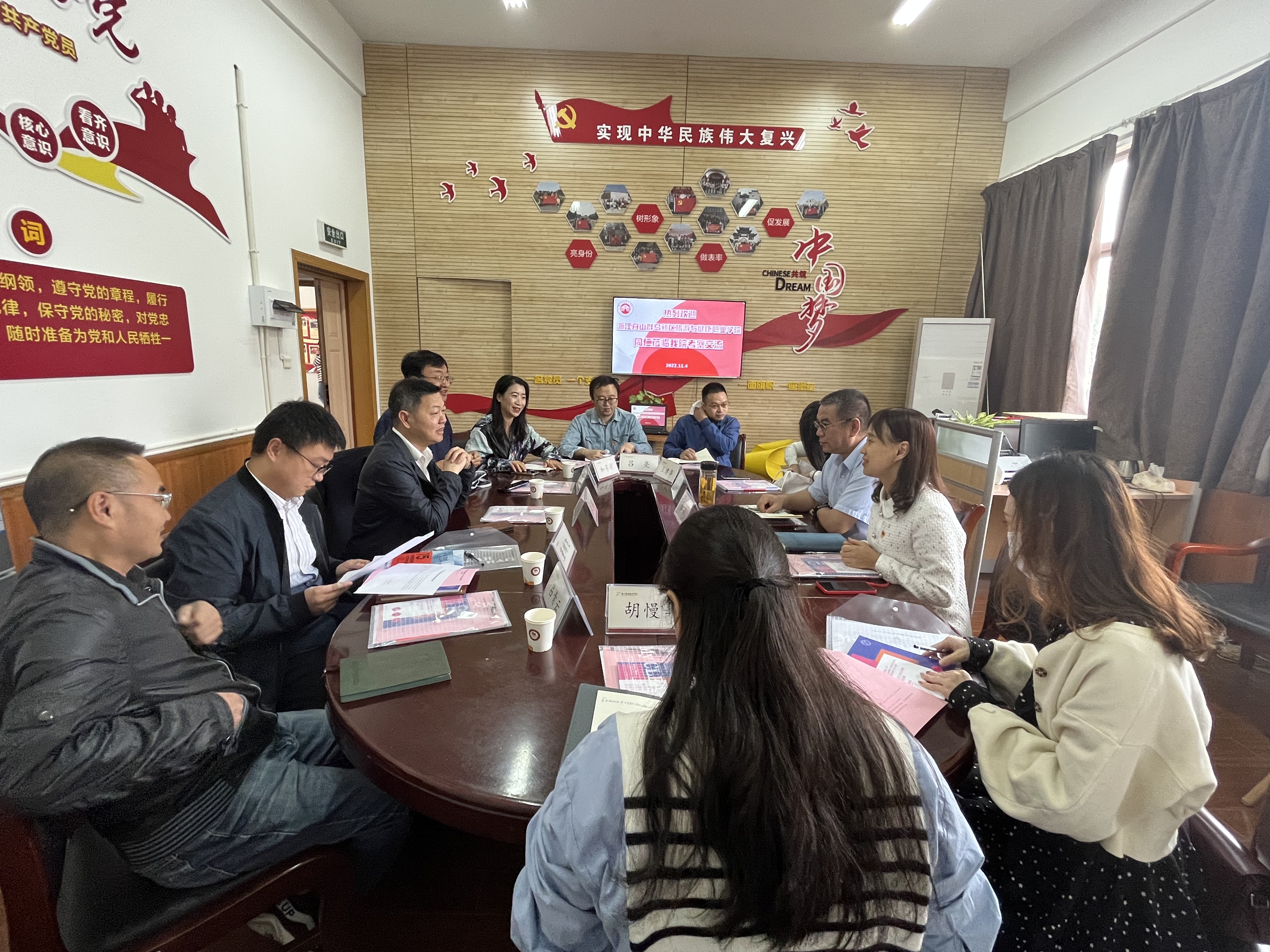 11月4日上午,浙江舟山群岛新区旅游与健康职业学院人文社科与体育部主任张毅带领思政教研室全体教师一行来我校开展校际交流。交流座谈会在马克思主义学院13102会议室举行,交流会由直属马克思主义学院党支部书记、副院长陈毅主持,副院长胡卓群、思政理论课教师代表陈丽丽参与交流。