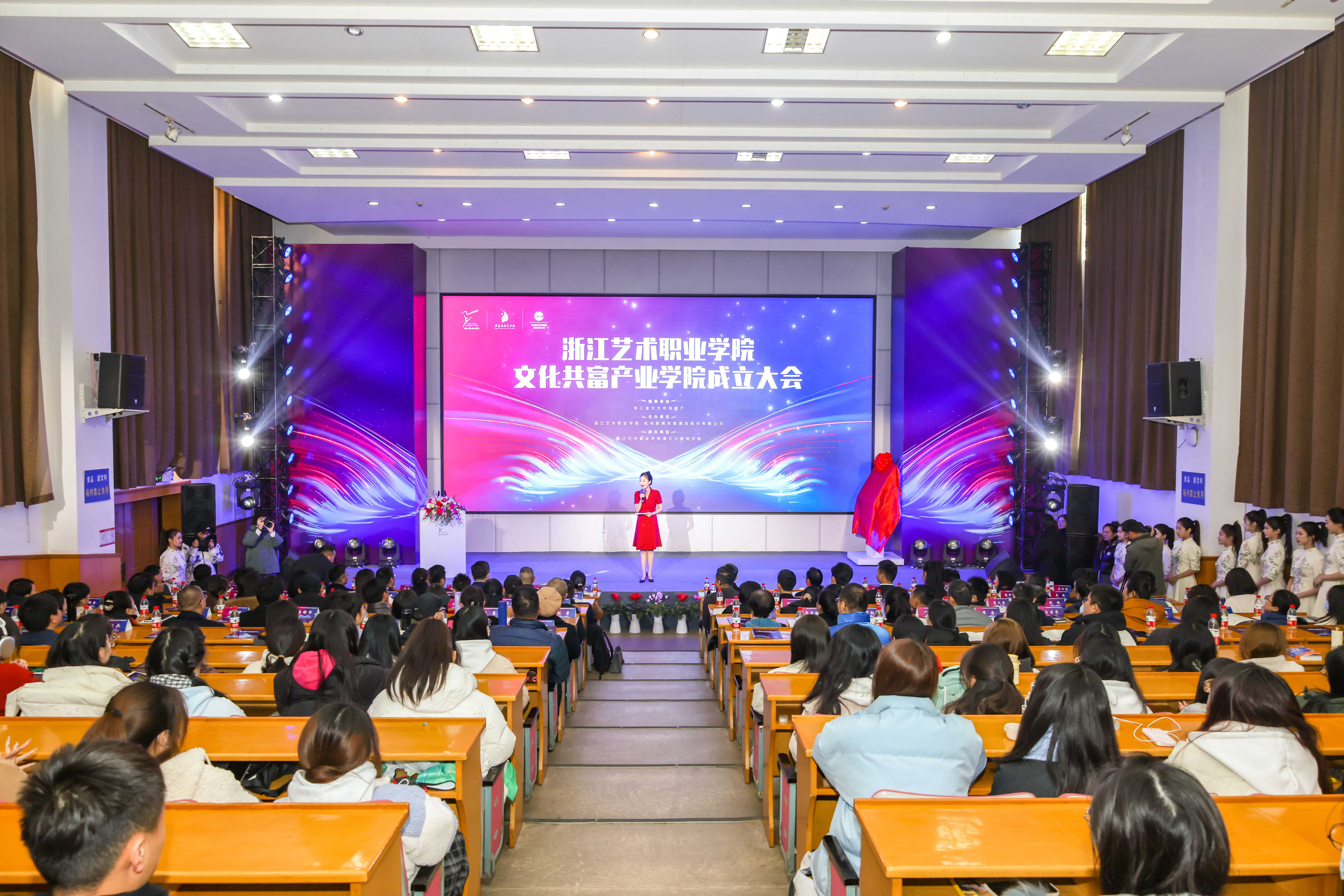 浙江省文化和旅游厅相关部门负责人,中共宁波市奉化区人民政府、宁波市奉化区文化和广电旅游体育局、宁波市奉化区文化和旅游集团、宁波市奉化区文化馆、萧山区戴村镇人民政府、杭州新青年歌舞团股份有限公司等单位领导、产业学院共建单位代表、浙江省舞台艺术“1111”人才代表和学校党委班子成员、中层干部、师生代表齐聚一堂,共同见证学校高质量发展迈上新台阶。