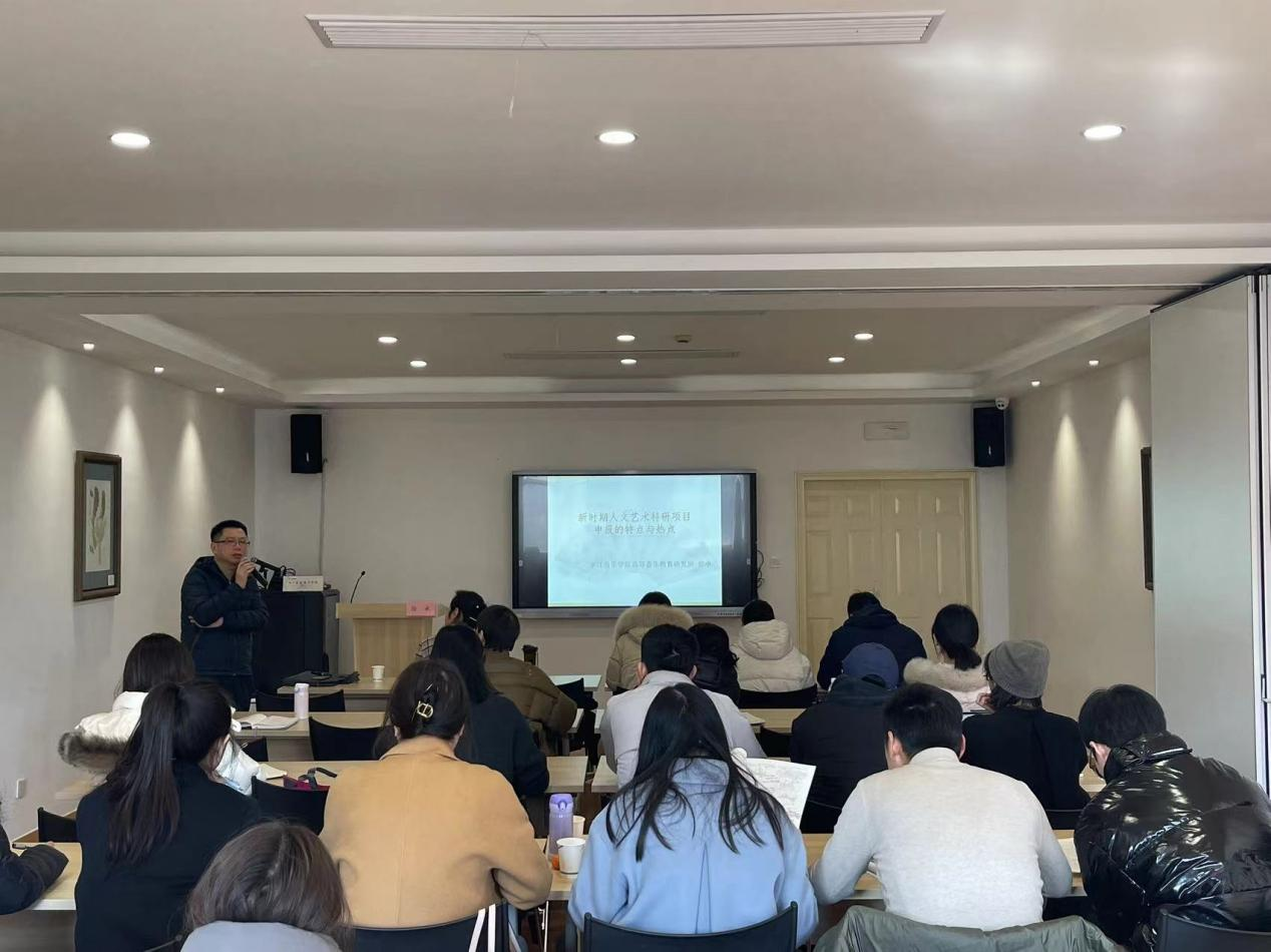 第一天进行科研培训。徐承以《新时期人文艺术科研项目申报的特点与热点》为题,首先梳理了艺术文化类科研项目类型,对适合部门教师申报的课题类型做了重点介绍。其次,他围绕科研课题申报技巧对科研选题、成果设定、成员组成及申报书的撰写设计等方面进行了详细的解读。他特别强调课题研究要突出地方性和唯一性,以小见大,更能体现出具体的实用价值和现实关怀。讲座结束后还与拟申报厅级以上课题的老师进行了一对一指导。