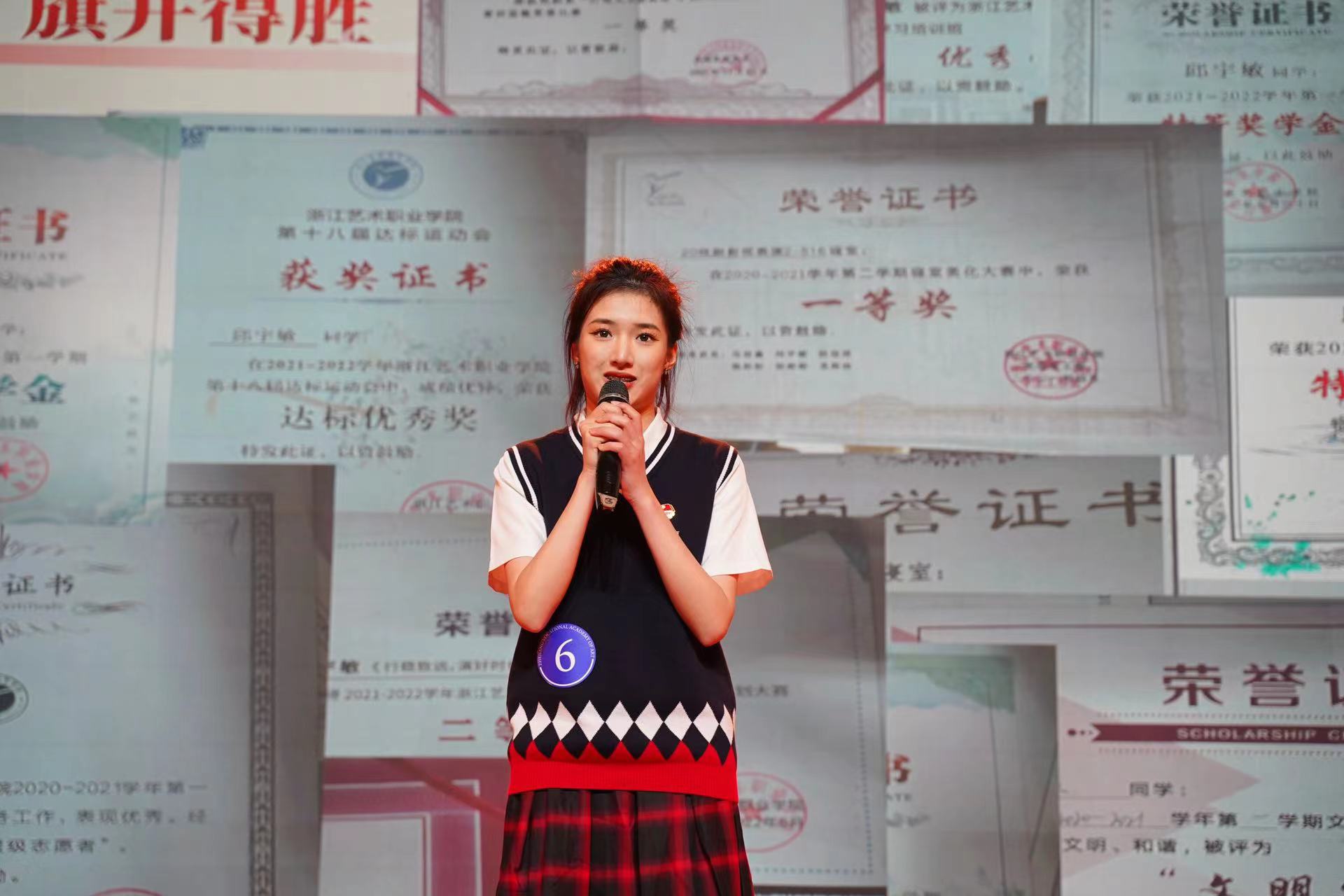 评选活动自3月中旬启动以来,经过各学院推选、公示、网络投票等环节,共产生20名候选人进入现场展示环节。他们有的潜心学习,成绩突出;有的奉献社会,手有余香;有的热心团学工作,关注自身成长;有的勇于创新创业,成绩斐然,是我校青年学生中的优秀代表。候选人们在现场对自己的经历娓娓道来,感人至深。音乐表演(器乐)古筝专业学生赵欣妮分享了怀揣对古筝、对民乐深沉而无限的热爱,通过努力拿下各类专业奖项的感人事迹;庄若宇分享了参演《红船》《梦游天姥》《西施别越》《灯火阑珊处》等大型优秀舞蹈作品,在浙艺的舞台上从紧张到从容的成长印记。