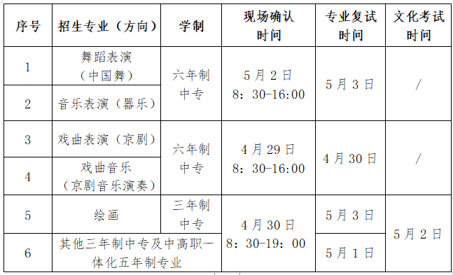 今年附中招生包括舞蹈表演、音乐表演、戏曲表演、时尚表演与传播等15个专业。六年制中专面向全国招收小学应届毕业生101人,三年制中专面向全国招收初中毕业生70人,中高职一体化五年制面向省内招收初中毕业生238人。附中招生报名于4月15日截止。