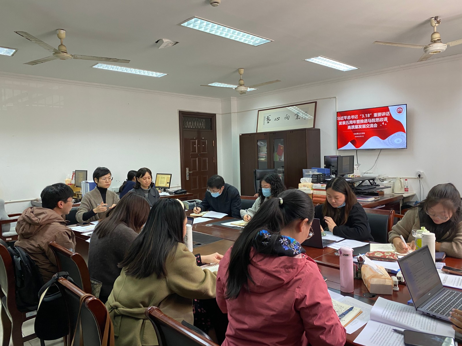 党的十八大以来,以习近平同志为核心的党中央高度重视学校思政课建设。2019年3月18日,习近平总书记亲自主持召开学校思想政治理论课教师座谈会并发表重要讲话。为系统总结我校思政课建设的成果和经验,深入推进新时代思政课高质量发展,3月21日,马克思主义学院召开习近平总书记“3.18”重要讲话发表五周年暨推进马院思政课高质量发展交流会,马院全体教职工参加会议。